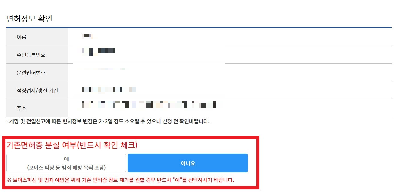면허정보 확인 후 기존면허증 분실 여부를 체크합니다. 모바일 운전면허증을 발급받는 경우 기존 운전면허증을 소지하고 있으면 아니오를 클릭합니다.