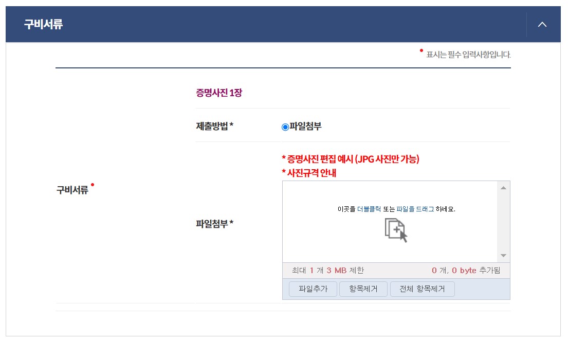 - 규격 : 6개월 이내 촬영한 가로 3.5cm×세로 4.5cm의 모자 등을 쓰지 않은 상반신 사진