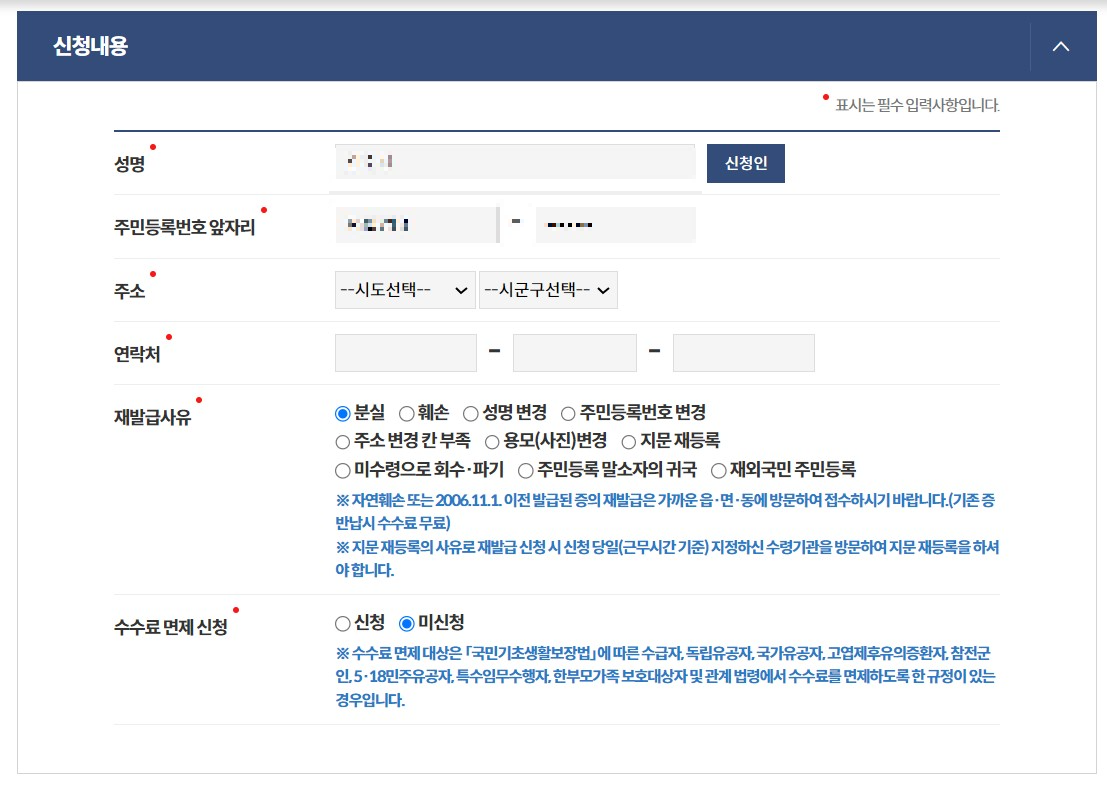 성명, 주민등록번호, 주소, 연락처를 작성하고 재발급 사유 중 해당사항을 클릭합니다.